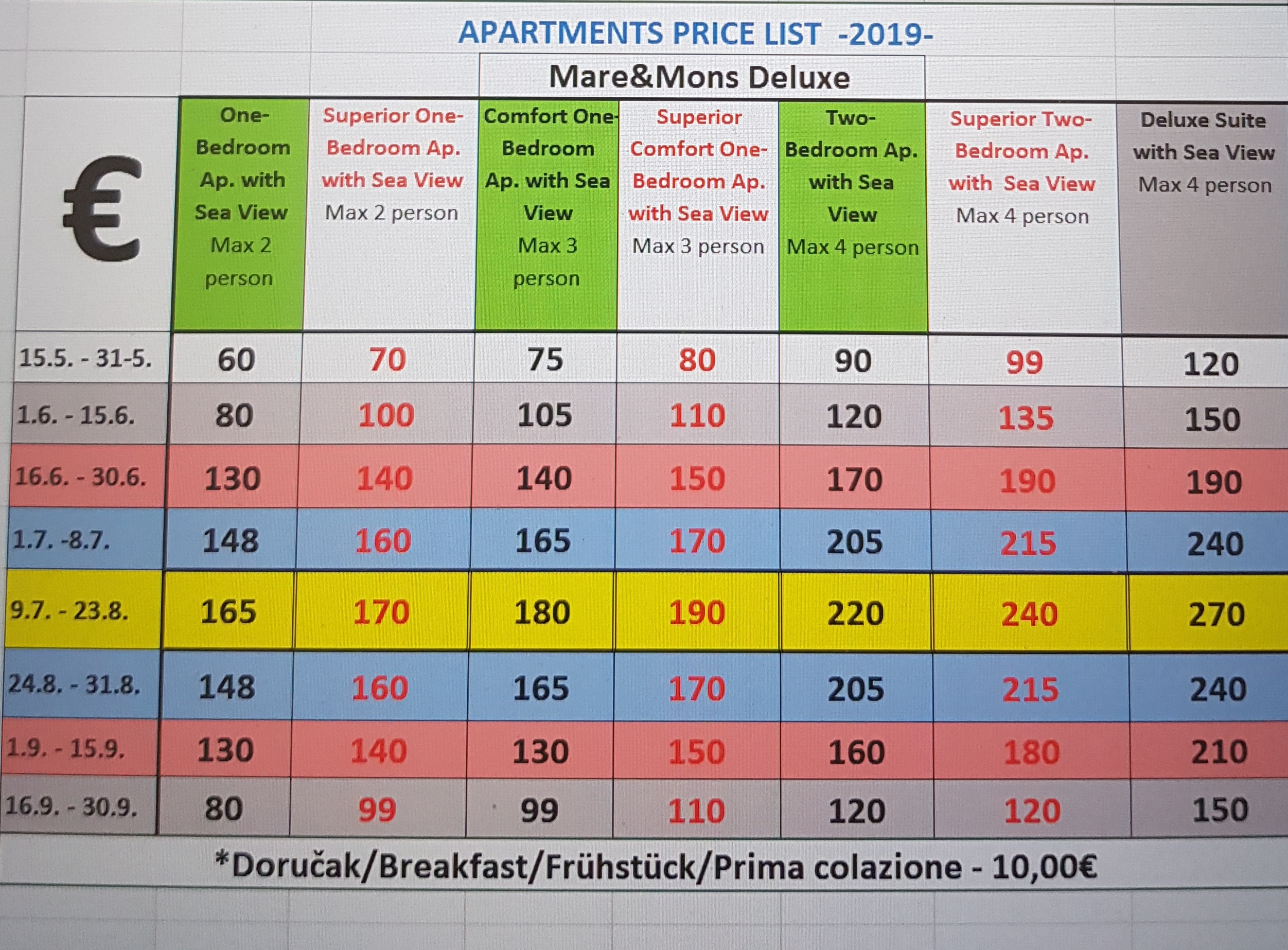 Cijena u EUR/HRK - po apartmanu/sobi po danu Sve cijene uključuju PDV. Boravišna pristojba uključena je u cijenu. Cijena uključuje: posteljinu, ručnike, tjedno mijenjanje posteljine i završno čišćenje. Ručnike mijenjamo dva puta tjedno. Jedno dijete do tri godine starosti boravi besplatno kada koristi postojeći krevet. Naplata za dijete starije od 3 godine ili stariju osobu iznosi 30 eura po osobi po noći Maksimalan broj dodatnih kreveta u sobi je 1.