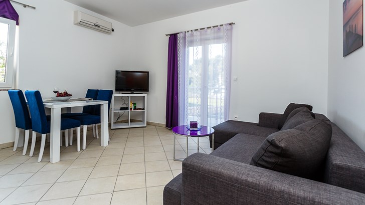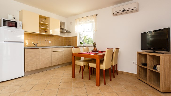В наших двухкомнатных апартаментах вы проснётесь под шум морских волн и очаровательный вид на морскую пучину. На частном пляже комплекс будете нежиться на солнышке, наслаждаясь быстрым интернетом и возбуждающими запахами Средиземноморья. На кухне вы найдёте всё необходимое для приготовления самых вкусных блюд, а если вам понадобятся ещё специи, вы спокойно их сорвёте в нашем саду, полном средиземноморских специй. Чтобы гарантировать вам прекрасное начало отдыха мы будем ожидать вас как дорогого друга с бутылкой лучшего хорватского вина. *