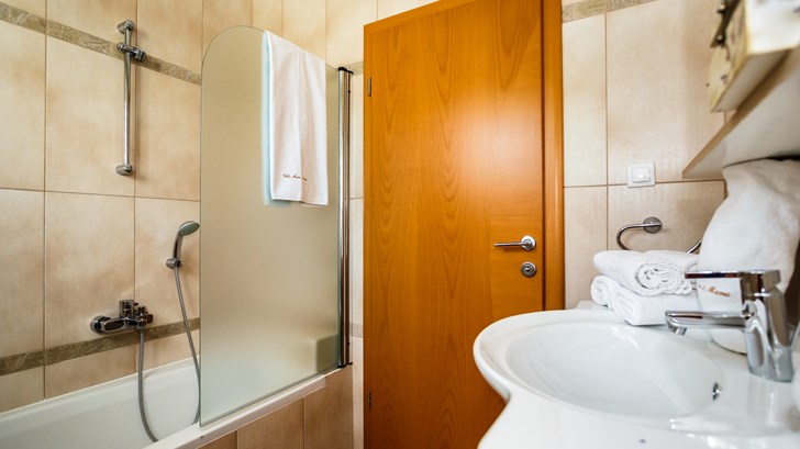 - Badezimmer mit Badewanne mit integrierter Dusche