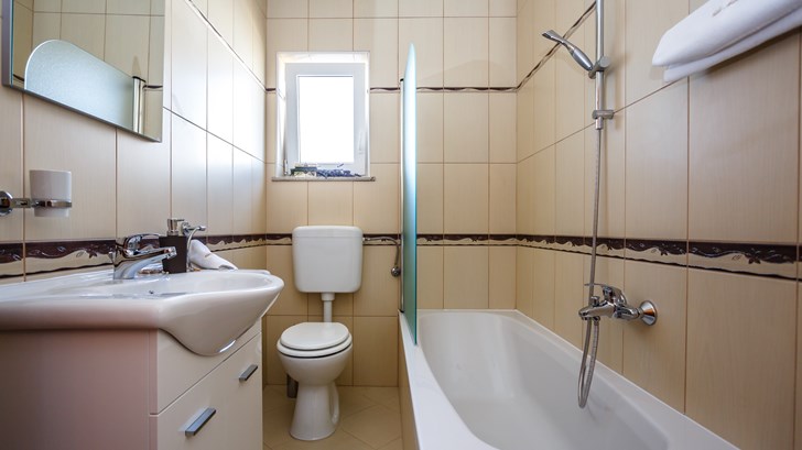 - Badezimmer mit Badewanne mit integrierter Dusche
